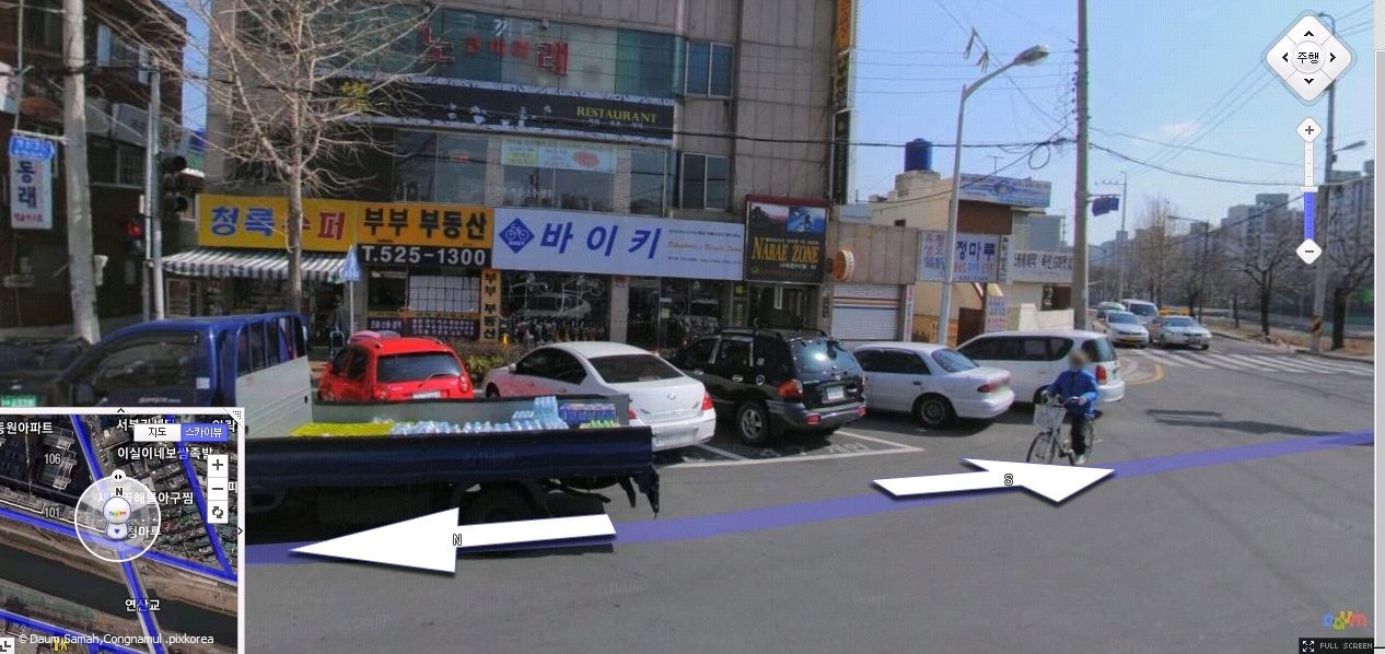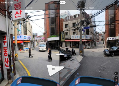 모바일버전이나 pc버전에서 카메라 모양으로 생긴 아이콘을 선택하게되면 다음지도 로드뷰를 실행할 수 있어요. 실제 장소를 그대로 옮겨놓은 화면을 보는 것이기 때문에 넓은 영역을 볼수는 없지만 정해진 스팟을 현재 서서 보는 것마냥 느낄 수 있어요.