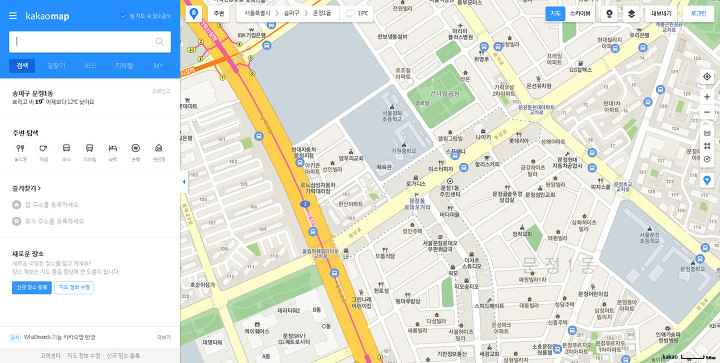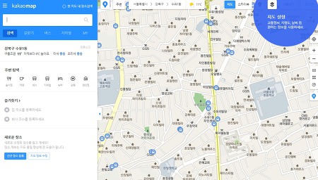 그럼 다음지도 길찾기 로드뷰 사용법을 살펴볼게요. 카카오맵 홈페이지로 접속을 한 모습이라고 합니다. 좌측에 보시면 여러가지 지도 연관 기능들이 있으며 그리고 그 오른쪽에 지도가 표시가 되는 것을 체크해보실 수가 있겠습니다.